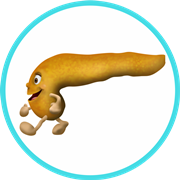Ez a vidám, bölcs Szervmanó a bélrendszerünk. Nagyon nagy tudású. A testben az a feladata, hogy felszívja a szervezet számára fontos tápanyagot, a vizet és az ásványi sókat, majd megszabaduljon a salakanyagtól. Tudja, mi a jó és mi a rossz nekünk…
